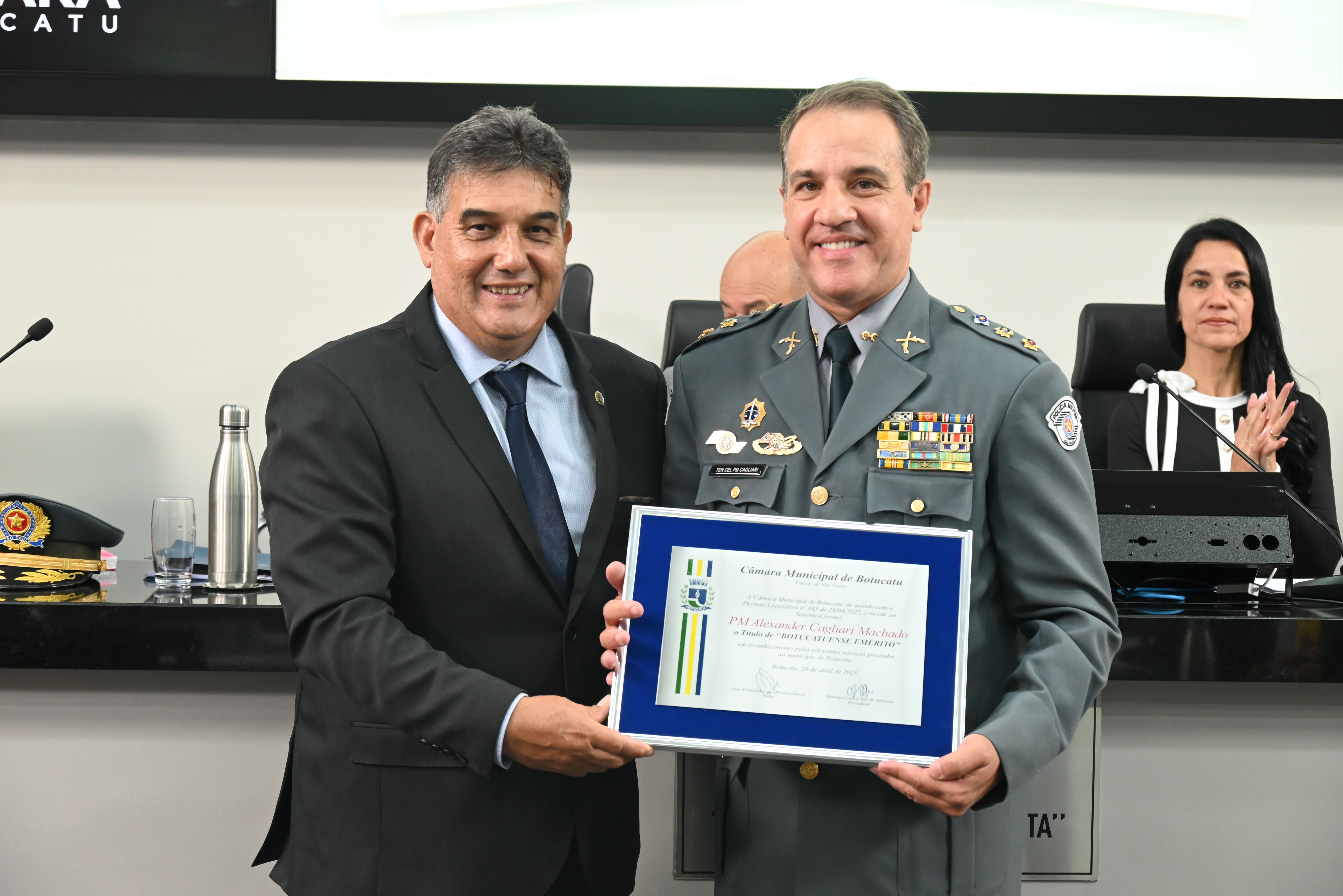 A Câmara Municipal de Botucatu realizou na noite desta sexta-feira, dia 07 de novembro, uma Sessão Solene para a entrega do Título de “Botucatuense Emérito” ao Tenente-Coronel PM Alexander Cagliari Machado.