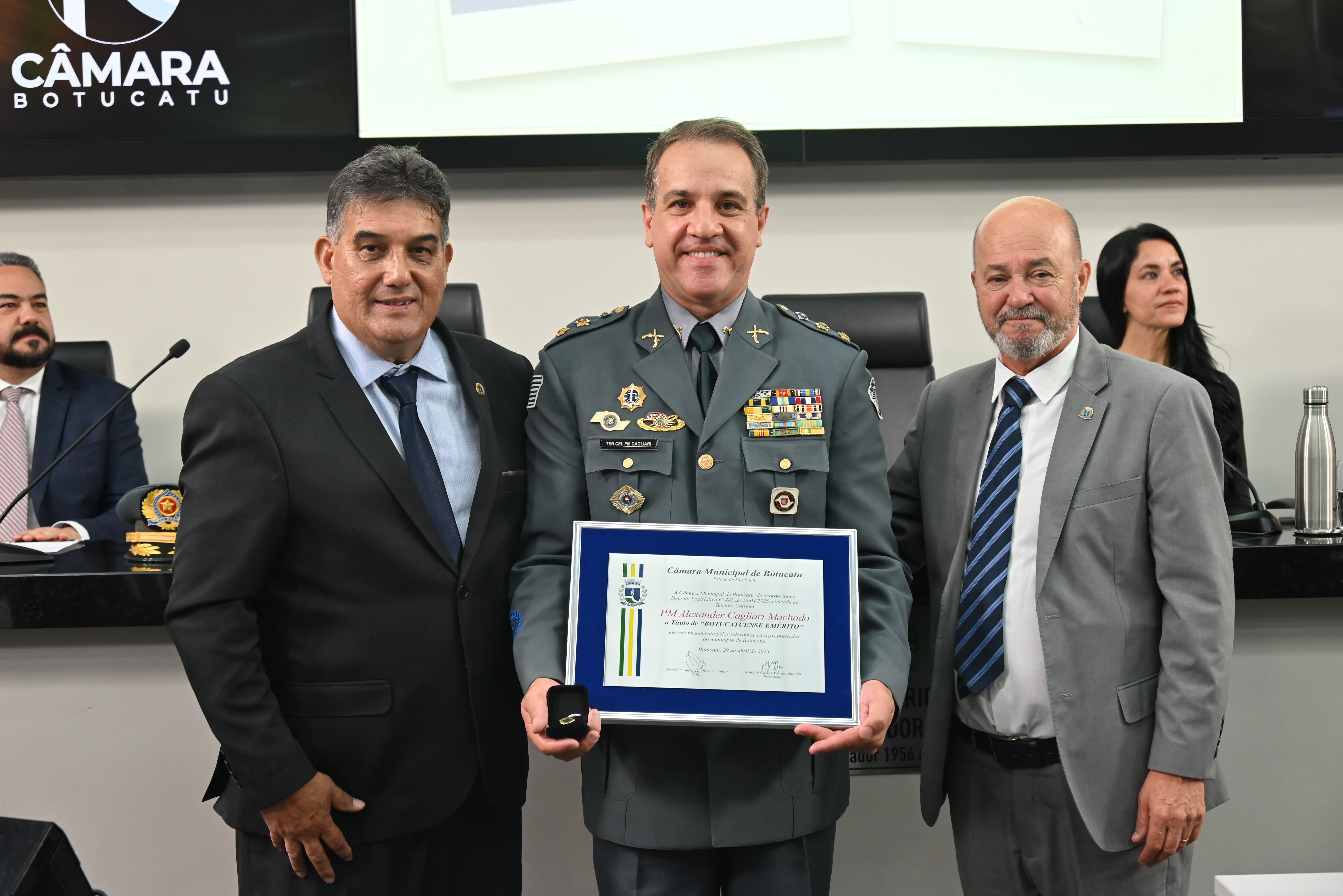 A Câmara Municipal de Botucatu realizou na noite desta sexta-feira, dia 07 de novembro, uma Sessão Solene para a entrega do Título de “Botucatuense Emérito” ao Tenente-Coronel PM Alexander Cagliari Machado.